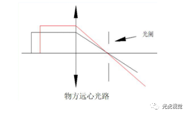 像方遠心光路的光路圖如下圖 。它是將孔徑光闌放置在物方焦平面上,像方主光線平行于光軸主光線的會聚中心位于像方無窮遠。這種鏡頭的特點是放大倍率與像距無關,可以消除像方調焦不準引入的測量誤差。