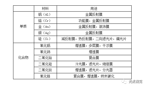常見的鍍膜材料如下表: